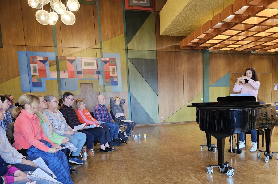 Ein Baby kann stundenlang schreien, ohne heiser zu werden, weil es noch die Bauchatmung beherrscht. Den meisten Erwachsenen kommt diese Fähigkeit irgendwann abhanden. Sabine Schilling hat uns im Workshop „Stimmfit in jedem Alter“ detailliert erklärt, wie wir es als Sänger*innen schaffen, die Bauchatmung wieder einzusetzen. Sie hat uns Übungen gezeigt, die wir als Vorbereitung zur Chorprobe machen können, unter anderem progressive Muskelentspannung und isometrische Übungen. Alles, was sie uns am Sonntag gezeigt und mit uns geübt hat, dient dazu die Stimme beim Singen richtig einzusetzen und damit zu schonen. Am Nachmittag haben wir anhand von verschiedenen Songs (Yemaja, Vem kan segla … und Flowers) noch einige Gesangstechniken ausprobieren können, die die Chöre hauptsächlich bei Popsongs einsetzen können.