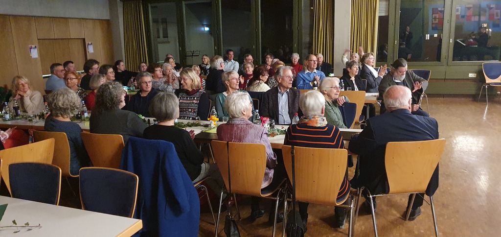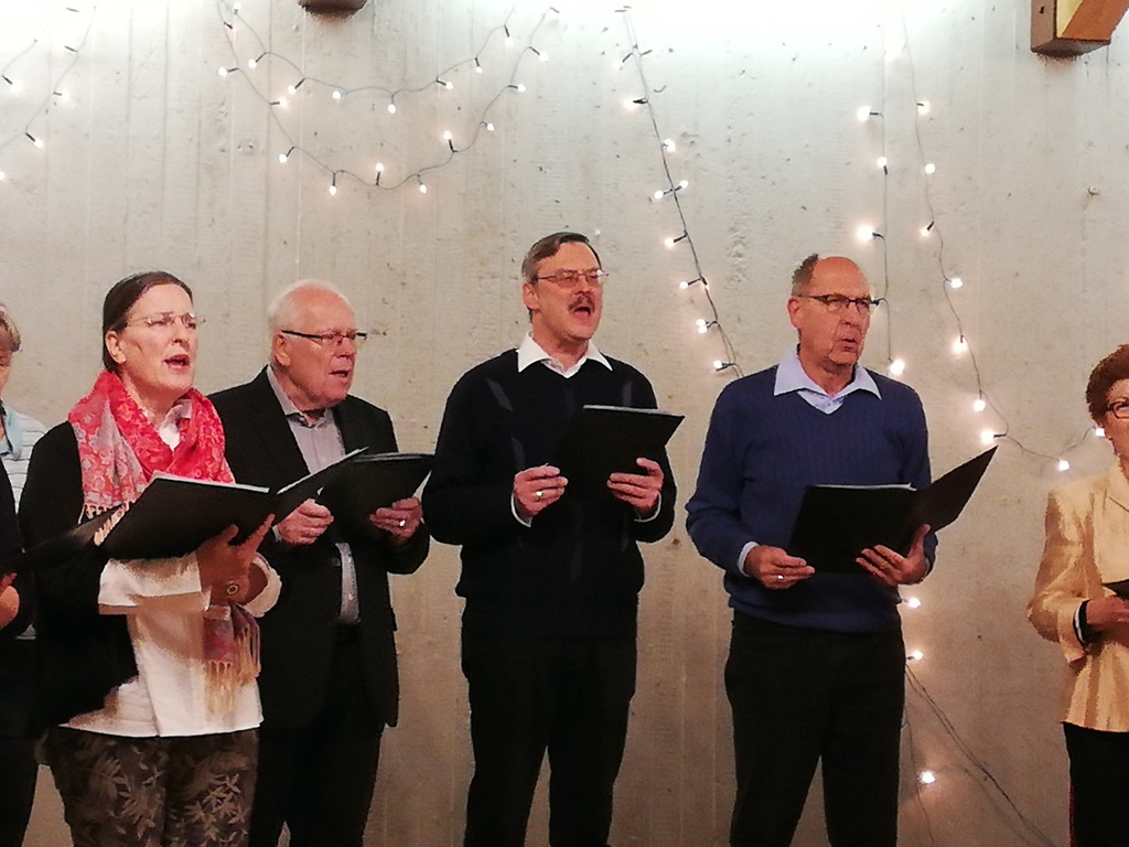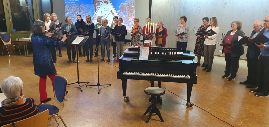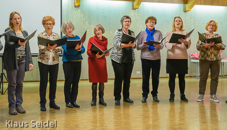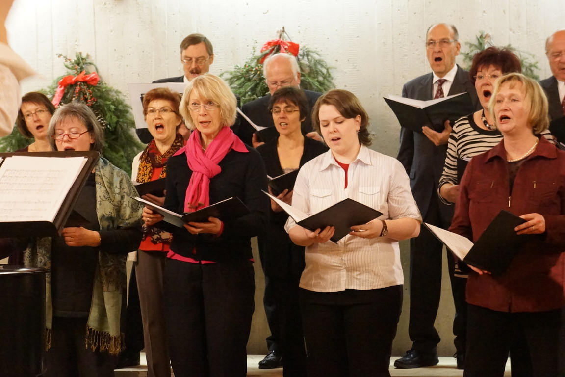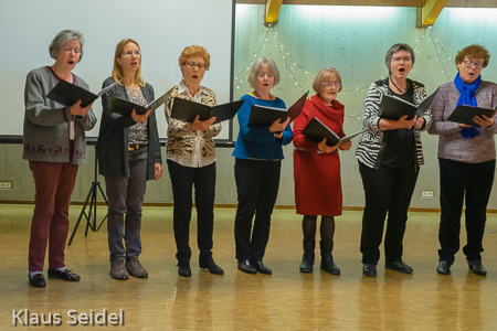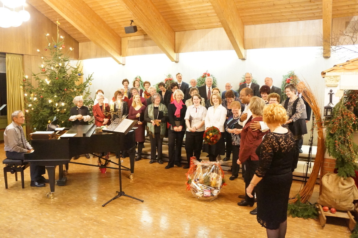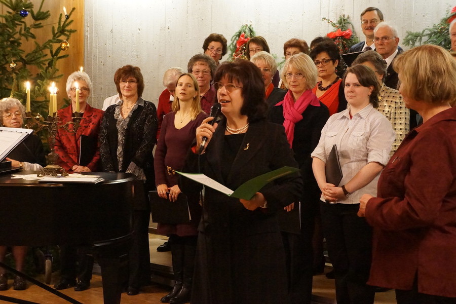 Beide Chöre konnten daher eine große weihnachtlich und fröhlich gestimmte Feierschar mit dem Chor „Freue Dich Welt“ von Händel begrüßen und in das Programm einstimmen. Nach erfrischend knappen Worten zur Begrüßung durch die 1. Vorsitzende ging es mit Manfred Bühlers „Heut kam ein Engel“ für beide Chöre weiter. Der Stammchor bot, ebenfalls von Bühler, „Friede auf Erden“, Frommlets „Zündet die Lichter der Freude an“ und Gerd Onnens „Gloria“. Hier zeigte sich, dass auch bei vermeintlich gut bekannten und seit langem zum festen Repertoire gehörenden Liedern Proben gut tun und eine intensive Beschäftigung lohnt.