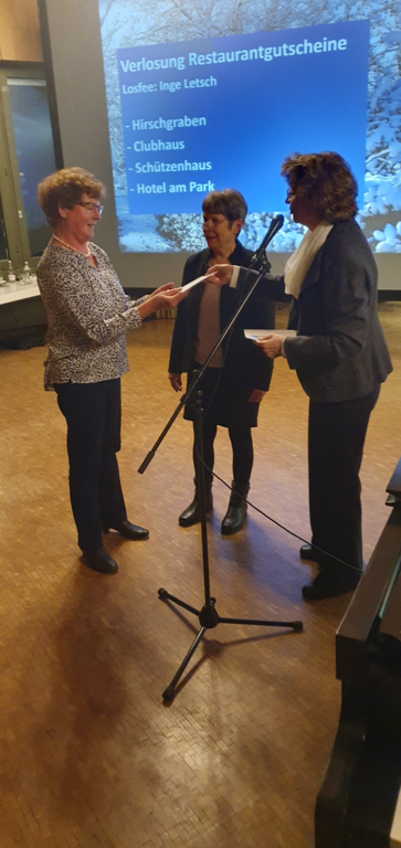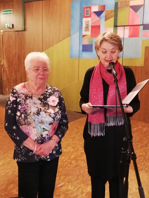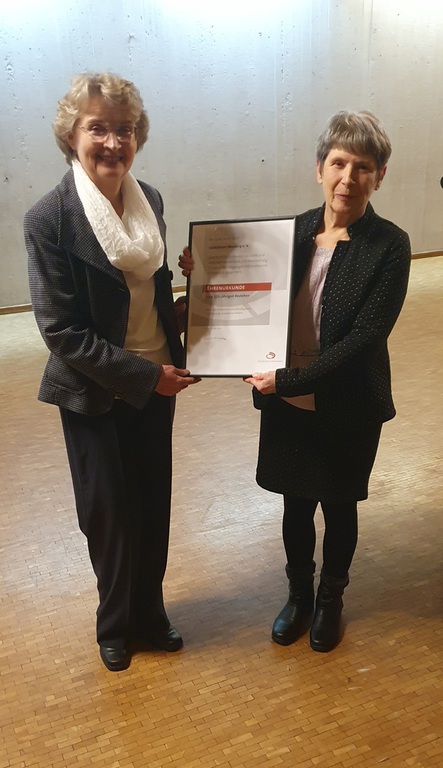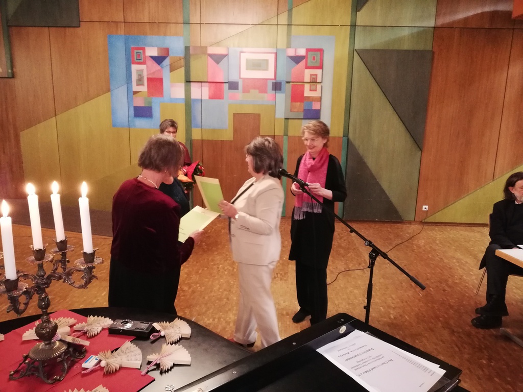 Drei Sängerkameradinnen standen zu Ehrungen an. Frau Fischer, die für 40 Jahre aktive bzw. passive Mitgliedschaft geehrt werden sollte, konnte leider nicht teilnehmen. Für 50 Jahre aktives Singen wurde Renate Kaller vom Deutschen Chorverband geehrt. Mit einer sehr persönlichen und warmherzigen Rede nahm Christine Eisert, die zweite Vorsitzende des Chorverbands Filder, diese Ehrung vor. Sie unterstrich zum einen die Verdienste und Leistungen von Renate, zum anderen auch die Bedeutung von ehrenamtlicher Tätigkeit über den einzelnen Verein hinaus. Susanne Baumeister schloss sich für den LKM diesen Glückwünschen an.