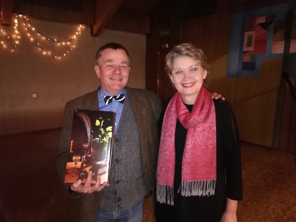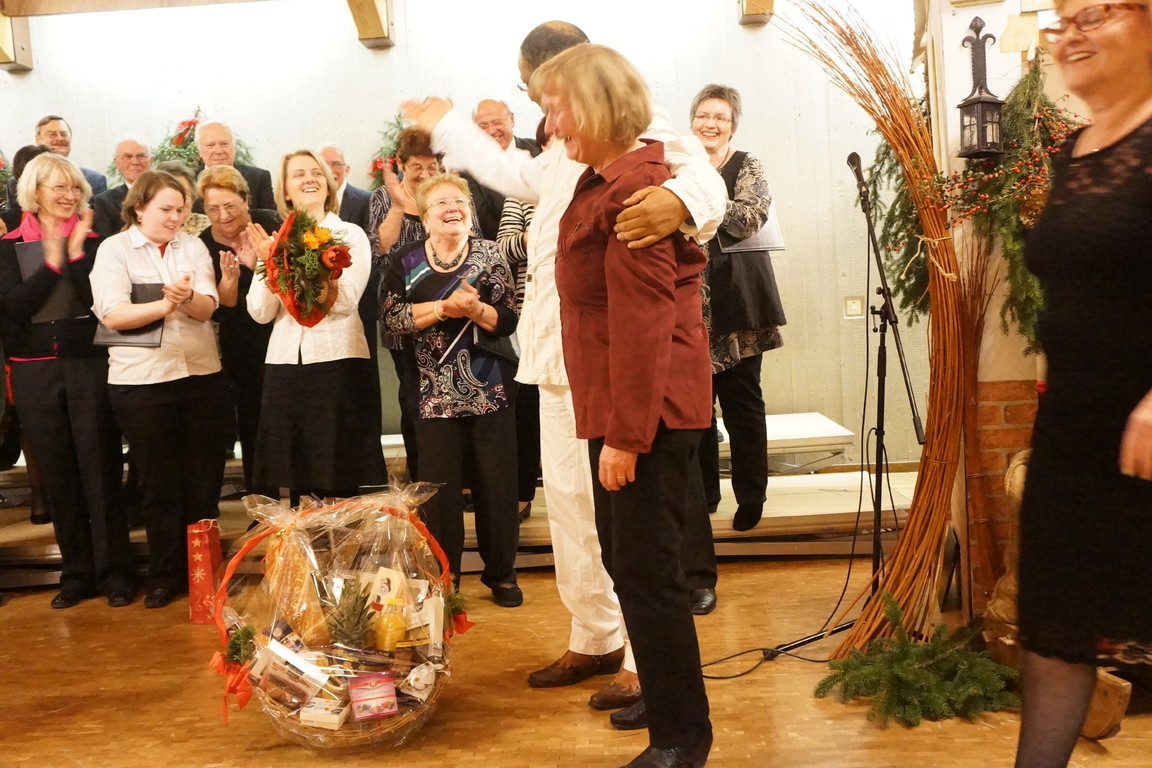 Anschließend bedankte sich die 1. Vorsitzende Susanne Baumeister mit kleinen Geschenken und Aufmerksamkeiten bei den Vorstands- und Ausschussmitgliedern, den Mitwirkenden des Abends und mit dem Ruf „Aislan, es gibt was zu essen“ (und einem üppig gefülltem "Fresskorb") beim Chorleiter, der an diesem Abend außer der Reihe einen großen Teil der Dirigate der stimmlich angeschlagenen Vizechorleiterin Sabine Hanel überließ, die diese Aufgabe locker stemmte. Die Unterstützung der Männerstimmen durch Aislans Bass war wunderbar.