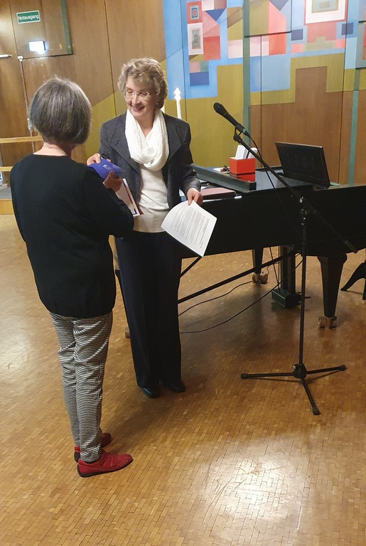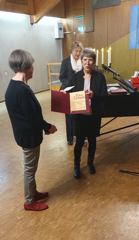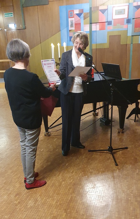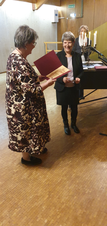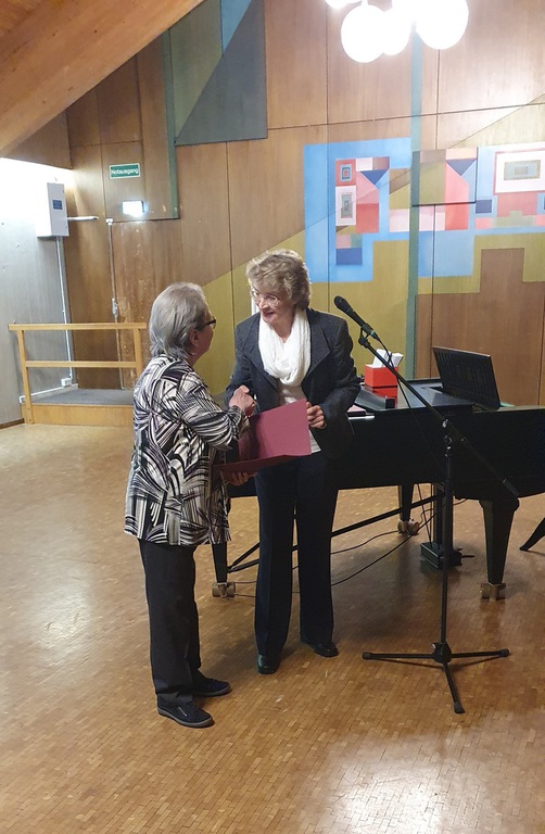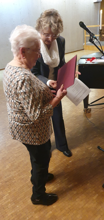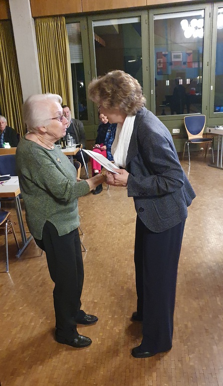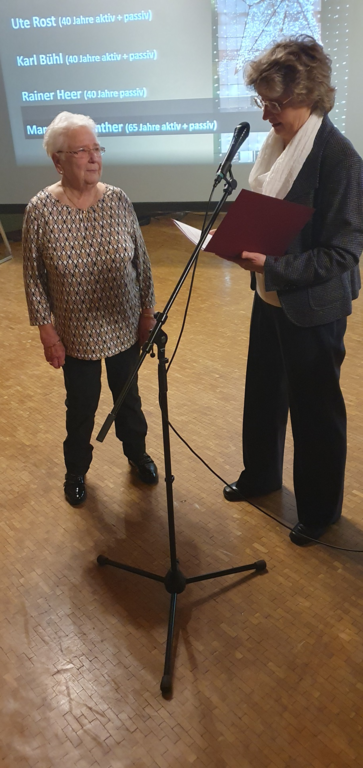 Gertrud Haußer wurde anschließend für 60 Jahre aktives Singen im LKM geehrt. Sie verkörpert als letztes noch aktives Gründungsmitglied des Frauenchores im LKM einen großen Teil der Vereinsgeschichte, seit den frühen 1950er-Jahren bis jetzt. Wir sind als Verein dankbar, dass wir Menschen haben, die durch alle Zeitläufte hindurch am Singen und am Verein festgehalten haben und weiterhin festhalten.