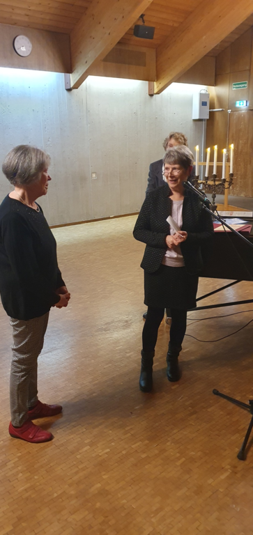 Gertrud hatte sich statt der ansonsten üblichen Aufmerksamkeit den Chor „Die Himmel rühmen des Ewigen Ehre“ von Beethoven gewünscht. Dieser Wunsch wurde von beiden Chören gerne mit spürbarer Begeisterung für dieses festliche Stück erfüllt.