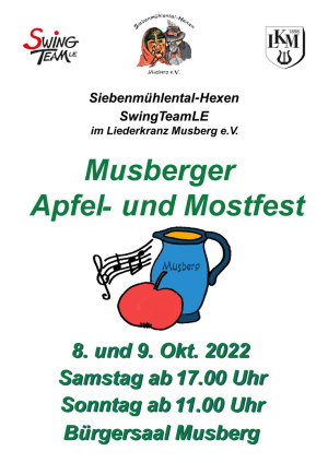 Die Siebenmühlental-Hexen freuen sich darauf, Sie im gewohnt liebevoll geschmückten Bürgersaal im herbstlichen Ambiente begrüßen zu können. Samstag 8.10. ab 17 Uhr und Sonntag 9.10. ab 11 Uhr. Das SwingTeamLE unter der Leitung von Uljana Lauterbach unterhält Sie mit schwungvollen Songs bei jeweils kurzen Auftritten am Samstag um 19 Uhr und am Sonntag um 15 Uhr.