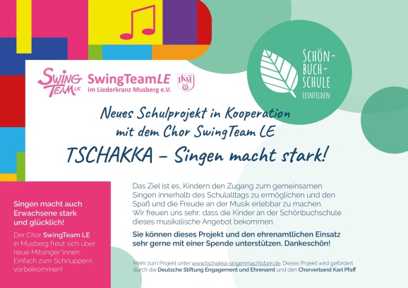 Das SwingTeamLE ist eine Kooperation mit der Schönbuchschule in Leinfelden eingegangen. Das Projekt TSCHAKKA – SINGEN MACHT STARK! wurde vom „Chorverband Karl Pfaff“ ins Leben gerufen und wird von ihm gefördert sowie von der „Deutschen Stiftung Engagement und Ehrenamt“. TSCHAKKA wird an der Schönbuchschule ab 2023 vom SwingTeamLE mitfinanziert und unsere Aufgabe besteht auch darin, weitere Spender mit ins Boot zu holen.
